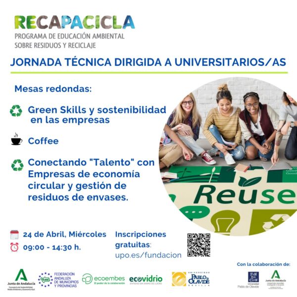 Dans le deuxième bloc, trois entreprises basées à Séville, mais d’envergure nationale et internationale, ont présenté leurs engagements en matière de durabilité et leur intérêt à offrir des opportunités d’emploi aux jeunes talents. Parmi les intervenants, Víctor Laso, ingénieur de production et d’amélioration chez Verallia Spain S.A., a fait part des initiatives de son entreprise pour attirer et recruter de nouveaux talents au sein d’un leader mondial de la fabrication de récipients en verre. Ensuite, Ana Llopis, présidente exécutive du groupe Llopis, a souligné l’importance de la vision, de la mission et des valeurs des entreprises engagées dans le développement durable, ainsi que la nécessité de sensibiliser l’ensemble de la chaîne de valeur à la gestion de la collecte des déchets en tant que point de départ de l’économie circulaire. Enfin, Francisco Menchén, directeur général de Coverpan S.L., a fait part de l’importance de ses produits dans l’économie circulaire, dans le but de sensibiliser les étudiants à la nécessité d’envisager des alternatives plus respectueuses de l’environnement dans le domaine de l’emballage.